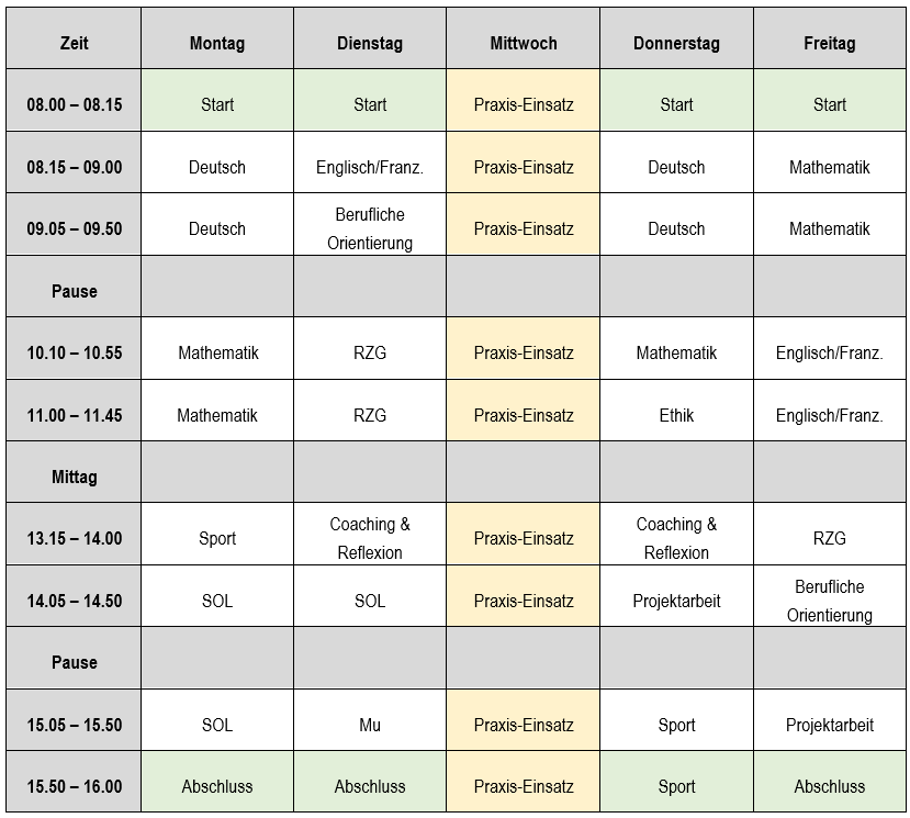 Der Tag beginnt jeweils mit einer gemeinsamen Startviertelstunde und wird mit einer Schlussviertelstunde abgeschlossen.
